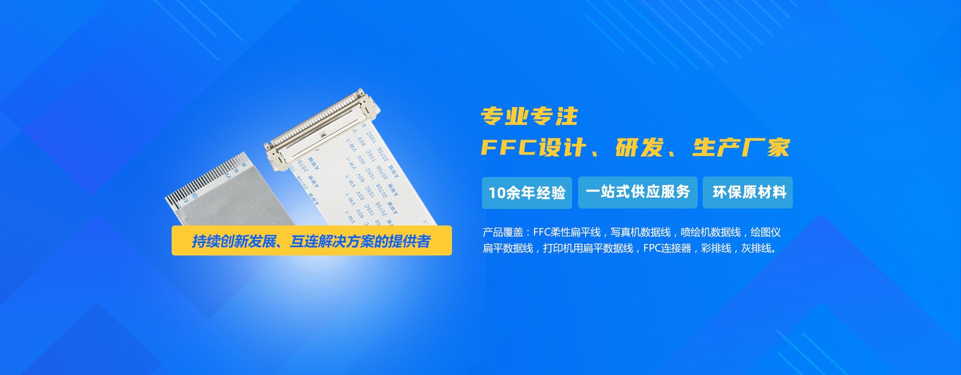 柔性扁平電纜 Flexible Flat Cable(FFC)可以任意選擇導(dǎo)線數(shù)目及間距,使聯(lián)線更方便,大大減少電子產(chǎn)品的體積,減少生產(chǎn)成本,提高